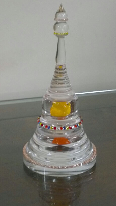 《甘露總集舍利塔》 上層裝臟由印度菩提迦耶佛陀法衣包裹之密意總集甘露;下層白色舍利子來自于聖地岡底斯山,黑色舍利子為第二世大寶法王把黑藥丸放于殊勝聖地納木湖所化現出的珍貴稀有舍利子。